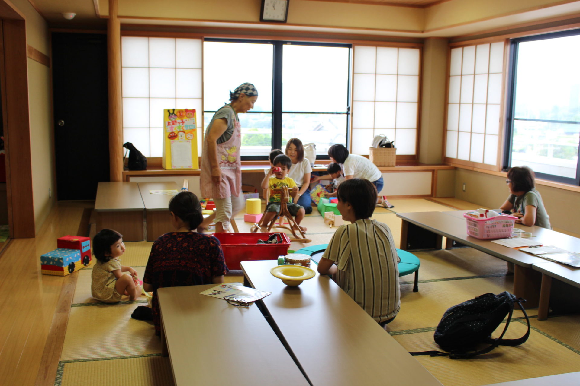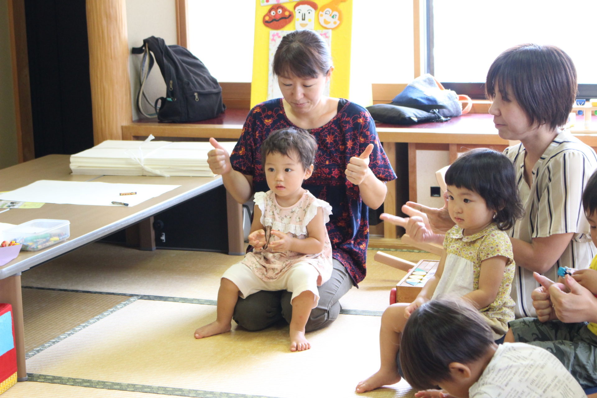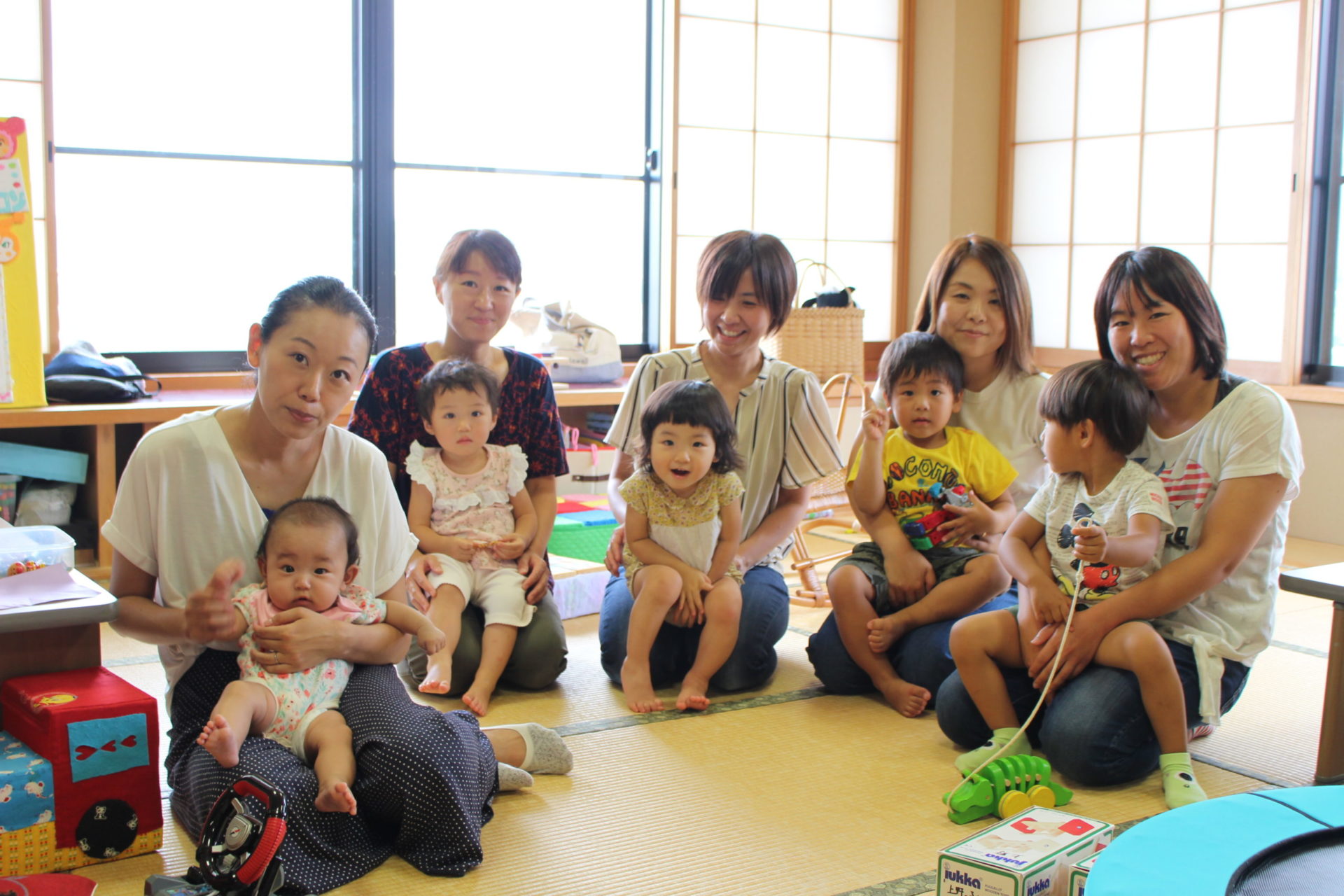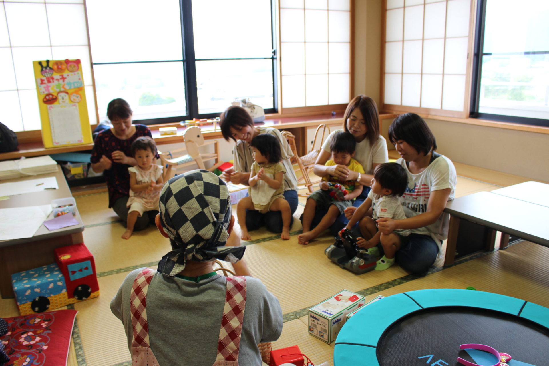 自由に遊んだ後は、手遊びやわらべうたをみんなで歌って、ママも子どもたちも笑顔で溢れていました。