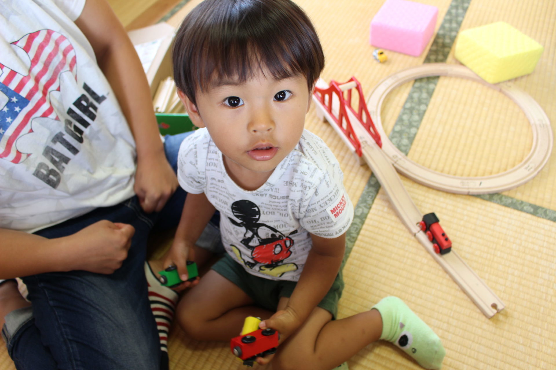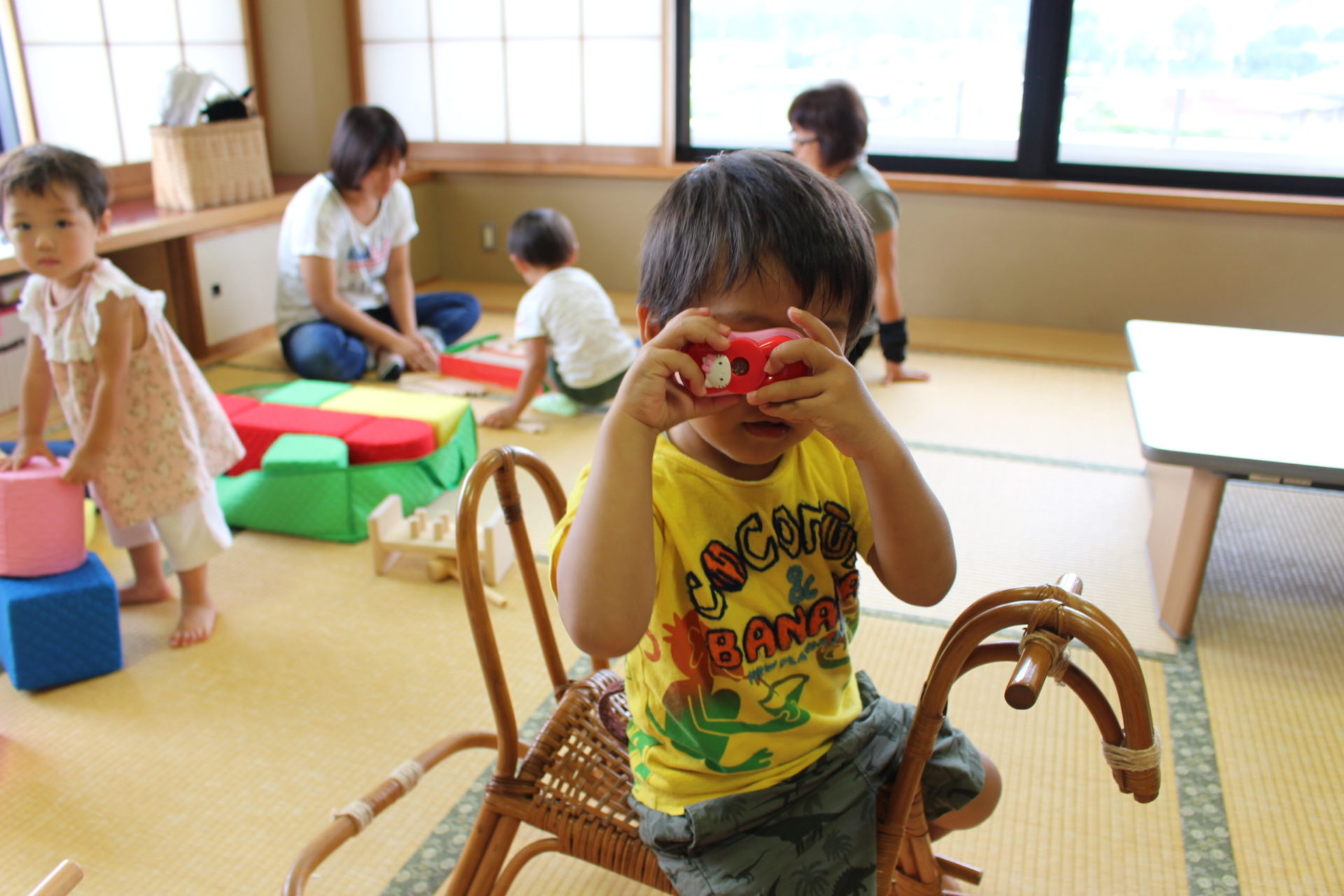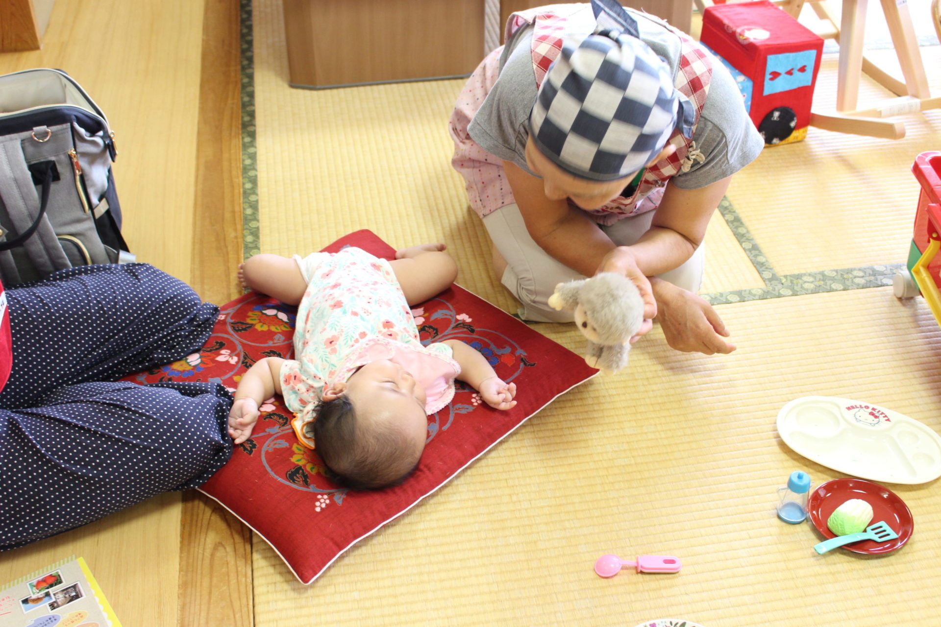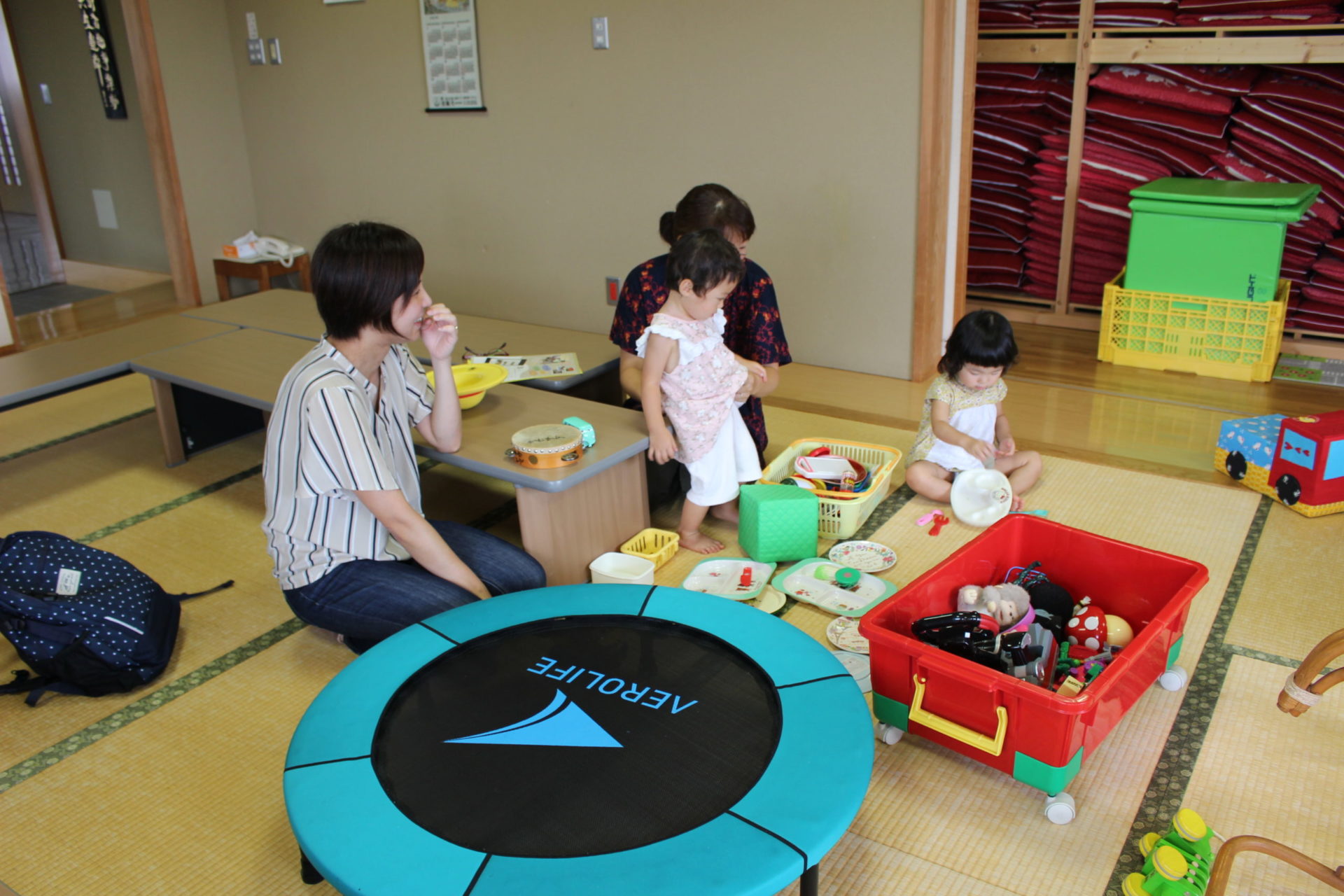 自由に遊んだ後は、手遊びやわらべうたをみんなで歌って、ママも子どもたちも笑顔で溢れていました。