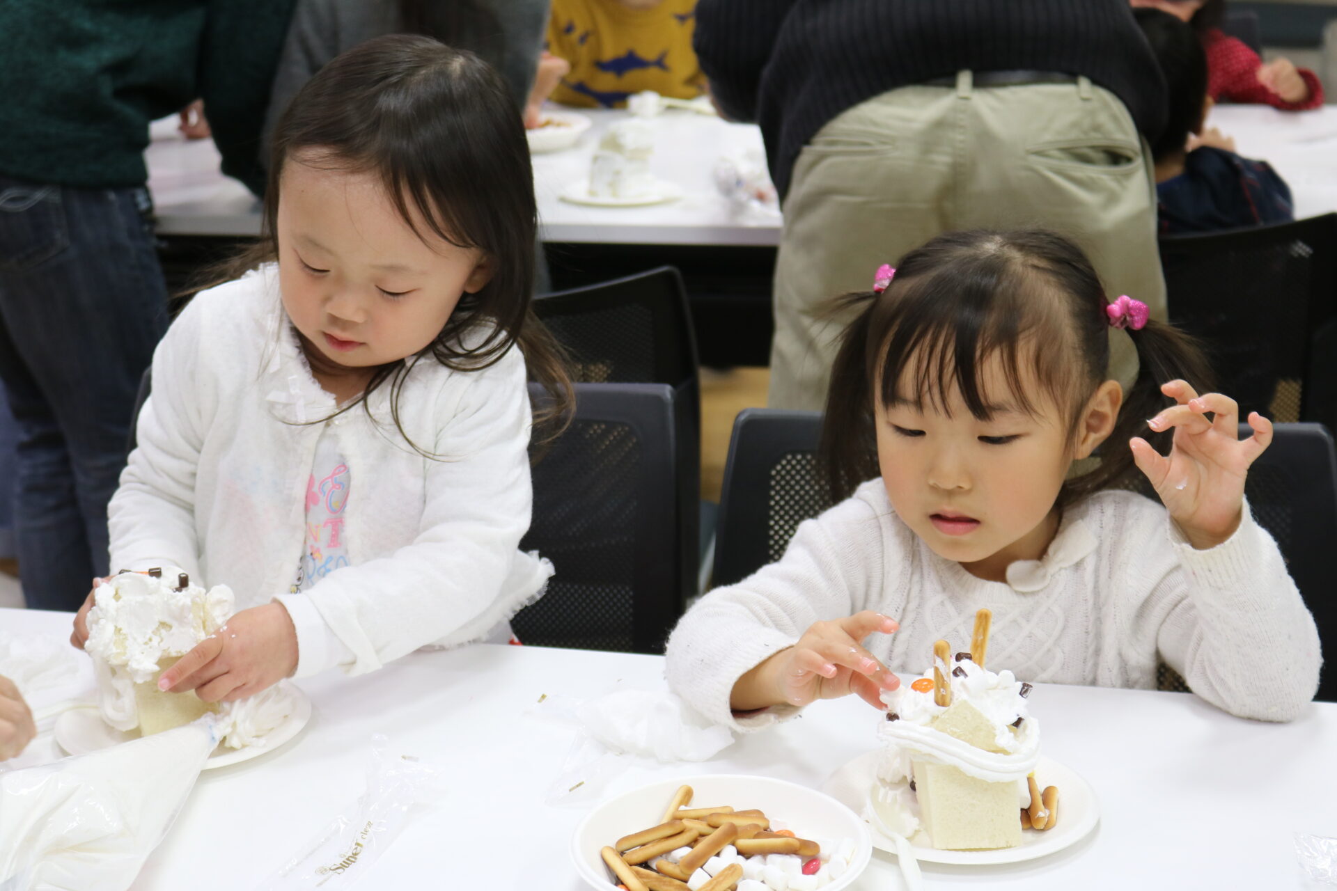 自分でクリームを塗ったり、チョコレートやマシュマロをデコったりと、小さい子でもできる内容のケーキ作りなので、みんなとても楽しそうでした。