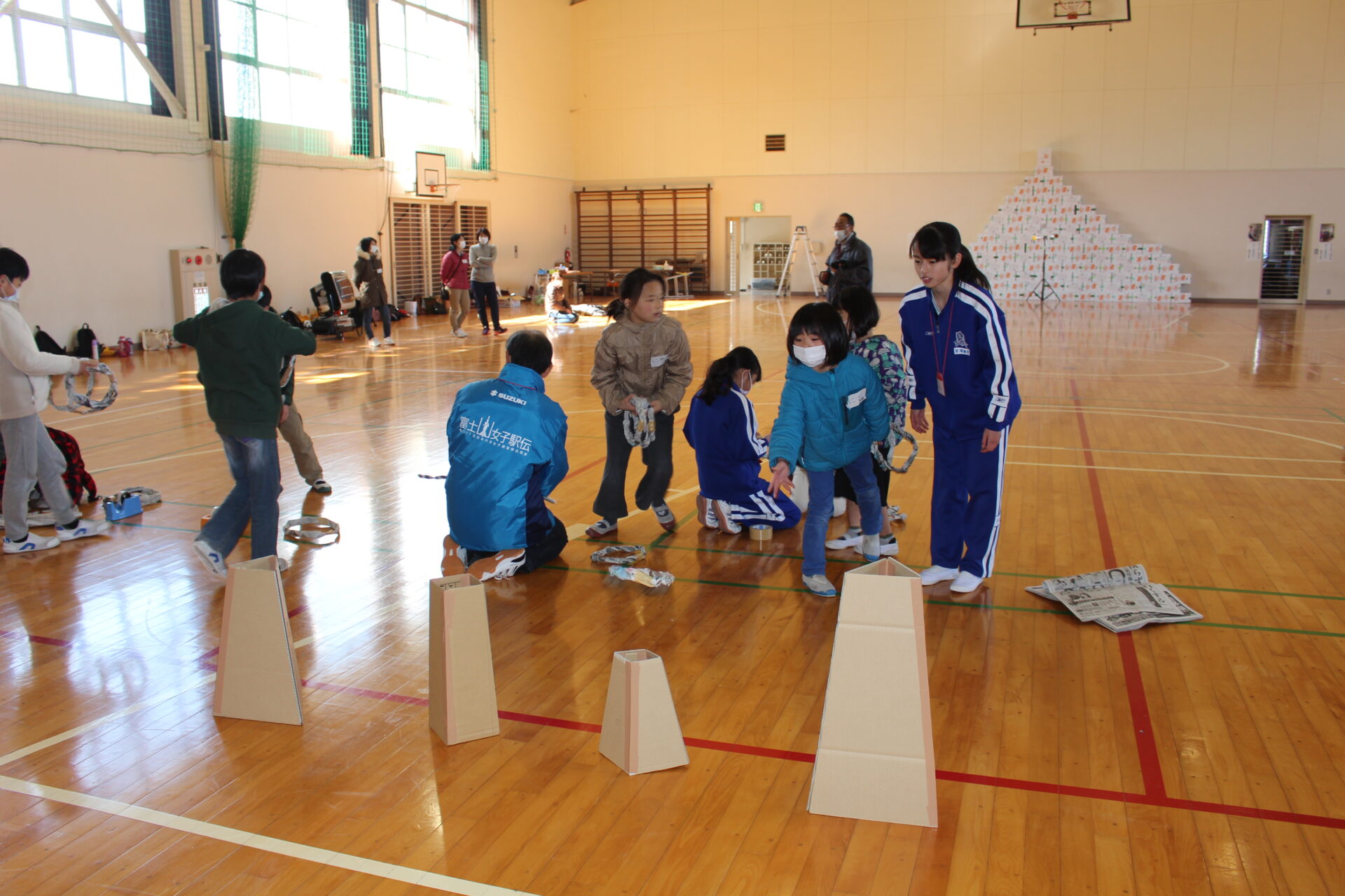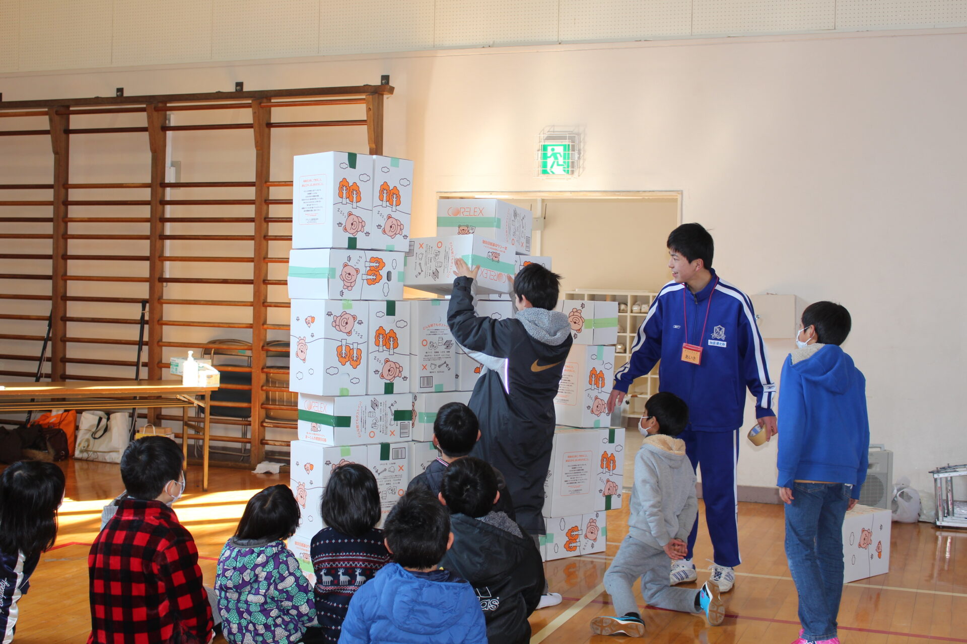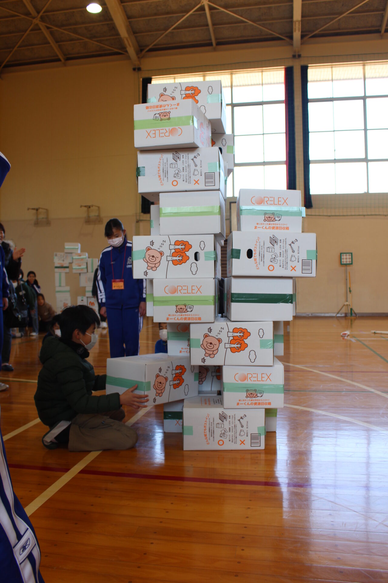 組み立てができたら、4チームに分かれて「段ボールジェンガ」で対戦しました。