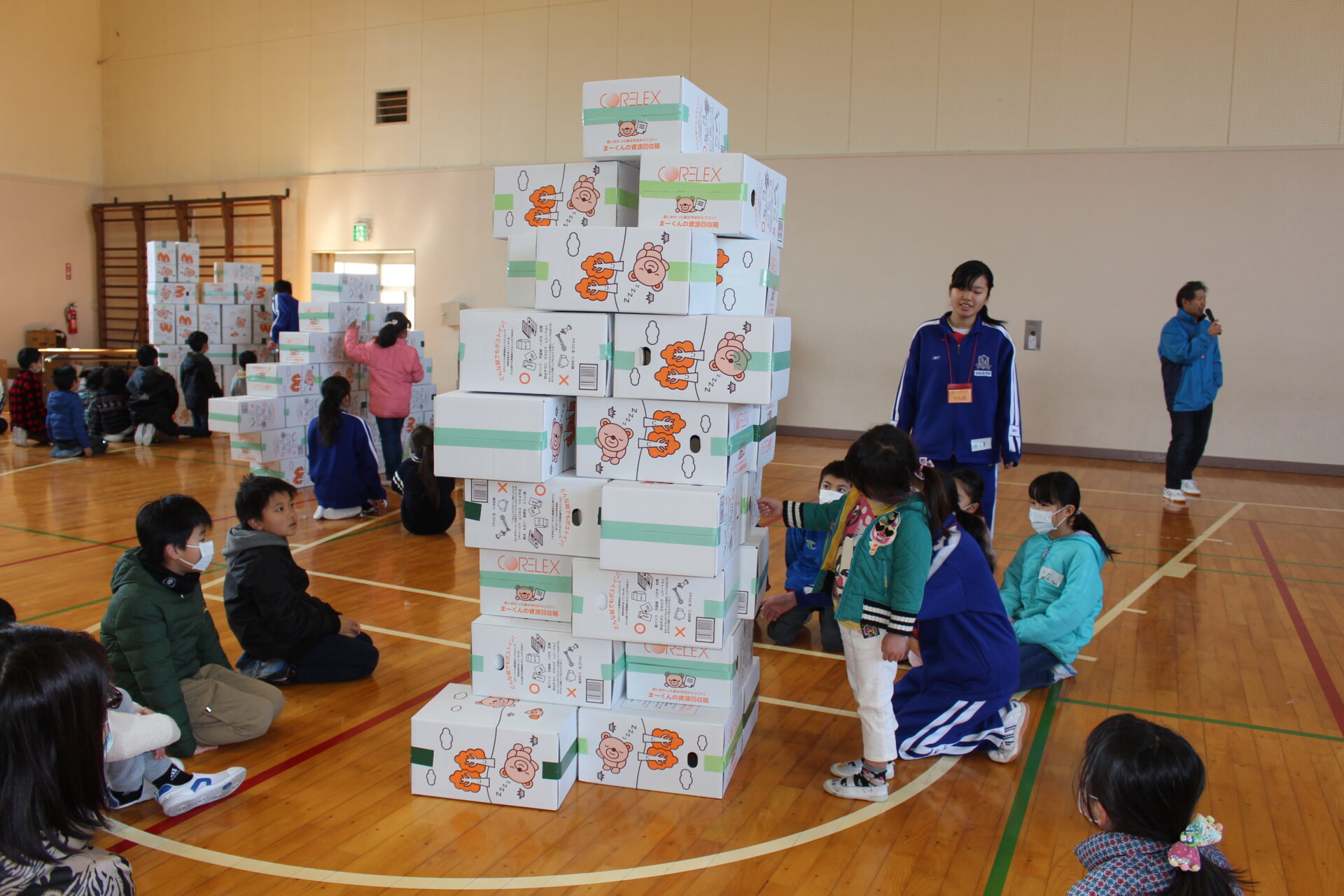 どのイベントも楽しそうでどれに参加しようか迷いましたが、我が家は3姉妹と一緒に上井出小学校で行われた「100コの段ボールで大運動会!」に参加しました。