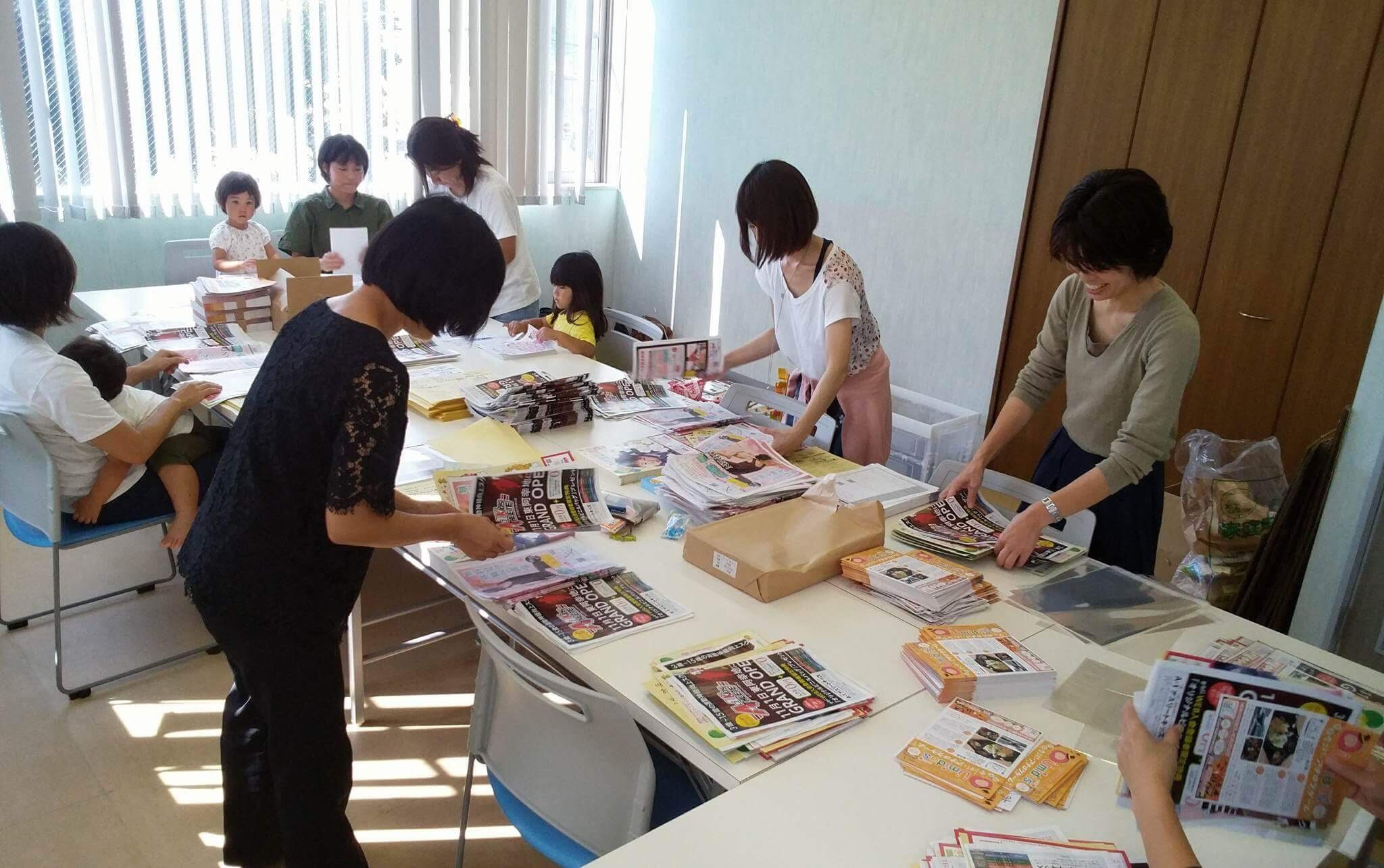 チラシを重ねて封筒に詰める・・・もちろん手はまじめに仕事していますが、口では、子育てのことなどおしゃべりに花が咲きます!!