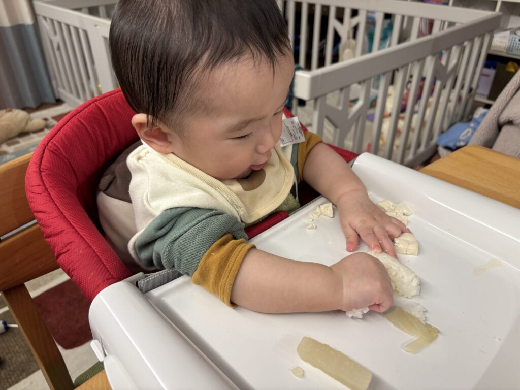 自分で考えるBLWの方法は、固いものや熱いもの、食べやすいものや食べにくいものを食べ物に触れることで学ぶことができます。
