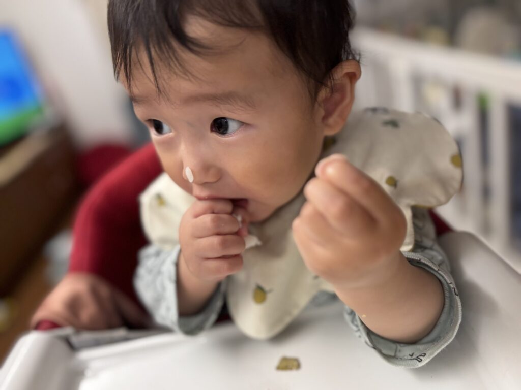 長男の時を思い出すと、自分で食べる経験が増えてきた頃に、ぱくぱく食べ始めていたような気がします。