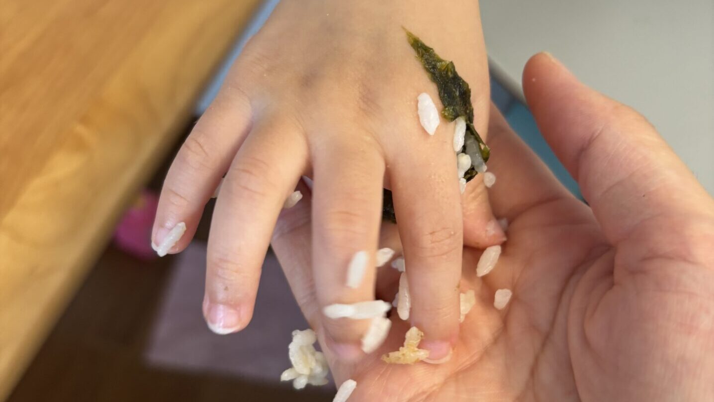 やり始めた当初は、これが毎日ずっと続くのかと、我慢できない時は大人が手伝うようにしていました。だんだんとお米は大人があげて、おかずは自分でという形で進めていましたが、ある時、お米を食べる様子を何だか観察したくなって次男の食べっぷりを観察するようにしました。