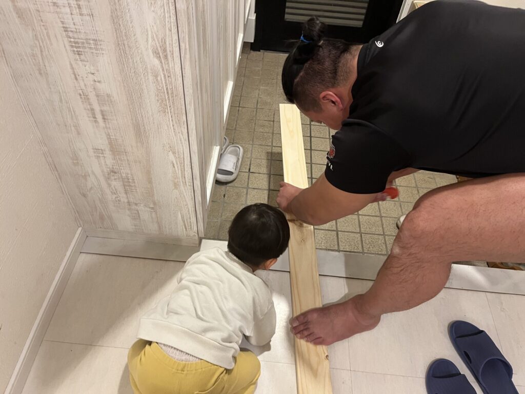 余った木材を使って一緒にドライバーを使い最初だけお手伝いしてもらい、雰囲気を楽しんでもらった後は、安全面を考え大人だけで仕上げました。