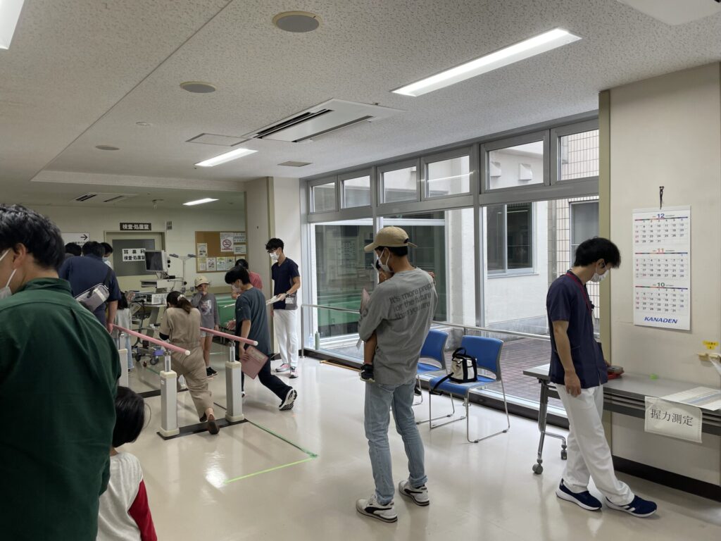 リハビリテーション科のブースでは、握力や大股歩きで何cm歩けるか、時間内で何回唾を飲み込めるかなどのテストで筋力や柔軟性、飲み込む力などの体年齢が測れました。