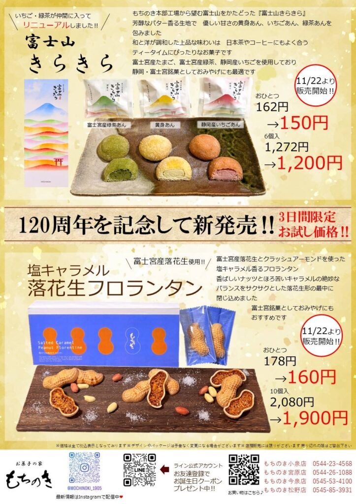 「明治38年の創業以来、もちのきは富士山の麓で地域の皆さまに支えられ、120年の歴史を重ねてまいりました。曽祖父の代から受け継がれ、私で4代目となります。日頃の感謝を込めて、今年は120周年祭を開催いたします。お菓子を通じて笑顔とご縁をつなぎ、地元の食材を使った新商品で地域の活性化に少しでも恩返しができたら幸いです。これからも伝統の味を大切にしながら、新しい時代に寄り添うおいしさを追求し、未来へと挑戦を続けてまいります。」