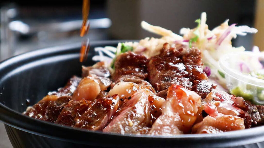 しっかりした味わいで、柔らかいのに食べ応えもあるアンガスビーフステーキをメインに、雑穀米、自家製サラダや副菜とともに丼仕立てにしました。
