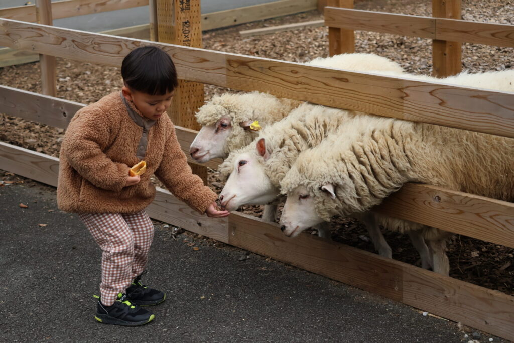 息子がおやつを持って放牧場に入ると、5〜6匹の羊が群がってきて、息子は笑いながら「追いかけてくるなよ!」と必死で逃げつつ、楽しそうに羊たちと追いかけっこ。