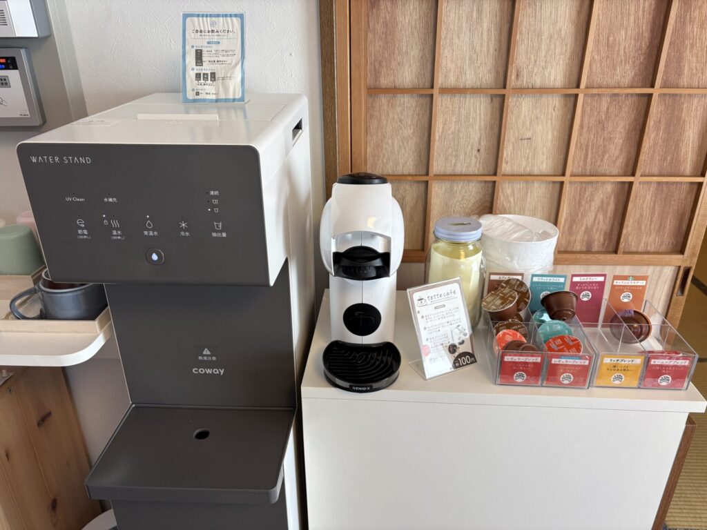 ランチルームにはウォーターサーバーやコーヒーメーカー(有料100円)、懐かしいマンガが並ぶ本棚もあります。(マンガが私の世代ドンピシャで胸熱でした…!歳がバレる。)