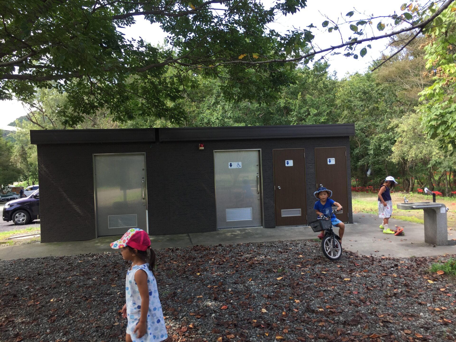 四阿や多目的広場、奥の水辺からはかなりの距離があるので、最初に済ませたり、