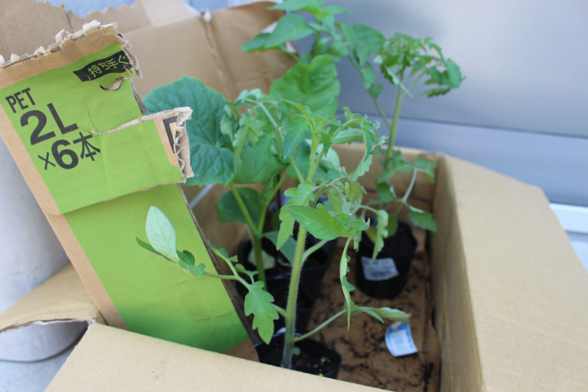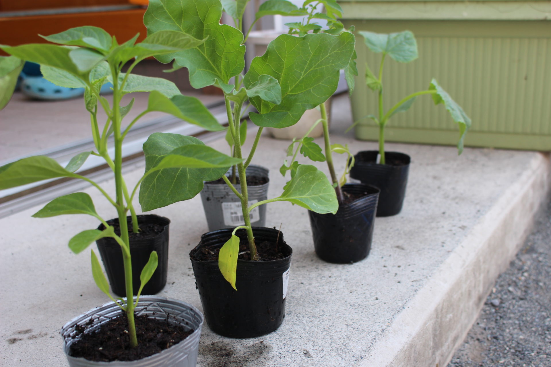 キュウリやなすなどのお野菜の苗を鉢植えにしていました。