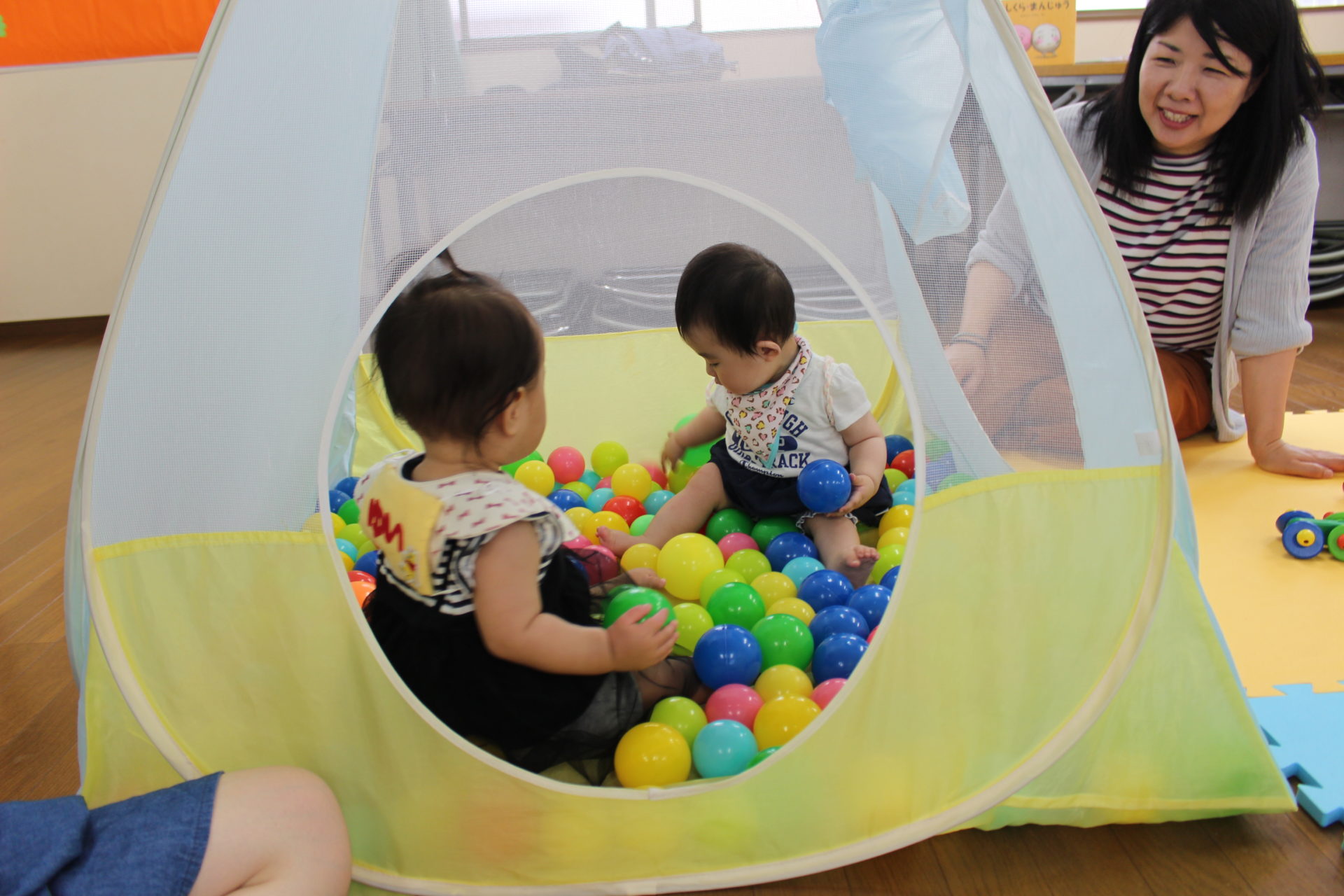 夏には、建物の横のスペースにビニールプールを出して水遊びもするそう。